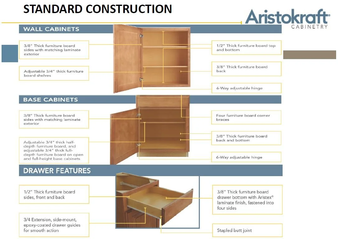 1-1/4” Full Overlay, Square Base & Wall Doors, Recessed Veneer Center Panel Door, Recessed Veneer 5 Piece Drawer Front, Miter Construction
